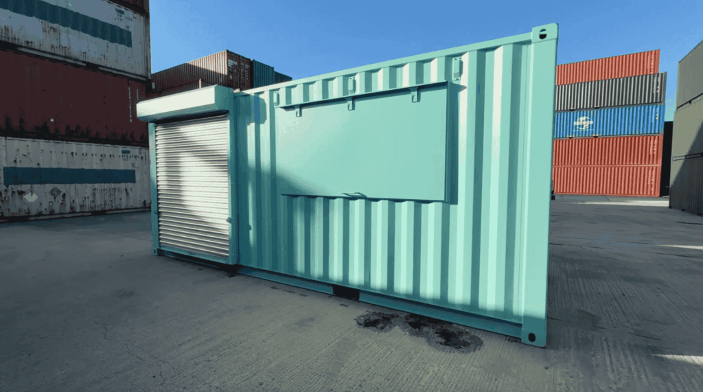 Judy approached us wanting a compact coffee shop built from a shipping container. It needed to be fully functional for daily service, with UPVC anthracite doors for customer access, a roller shutter for security, a serving hatch, and a small kitchen area complete with water heater and sink.